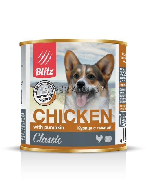 Blitz Classic Dog Chicken whith Pumpkin (Курица с тыквой), 400 гр — консервированный полнорационный для собак всех пород и возрастов с курицей и тыквой.