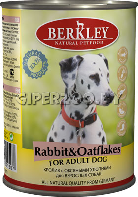Консервы Беркли Original для собак, кролик с овсяными хлопьями, 400 г. Полнорационное питание для взрослых собак. Кролик и овсяные хлопья с бульоном и оливковым маслом.