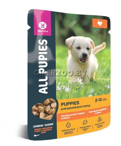 ALL PUPPIES для щенков тефтельки (индейка в соусе) пауч, 85 г - консервированный премиальный корм ALL PUPPIES для щенков подходит для кормления щенков всех пород, а также для беременных и кормящих собак. Он разработан на основе результатов последних исследований в области питания домашних животных, а также с учетом международных стандартов (AAFCO/FEDIAF).