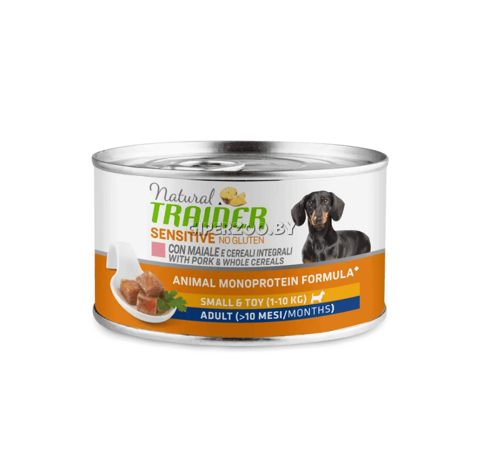 Trainer Natural Sensitive No Gluten Small&Toy Adult (Свинина), 150 гр - это консервированный корм со свининой и цельнозерновыми злаками для взрослых собак мелких и миниатюрных пород от 1 до 10 кг и старше 10 месяцев.