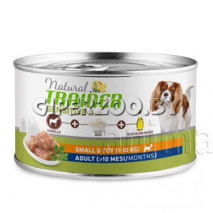 Консервы для собак Trainer Natural Sensitive Plus Small&Toy Adult (Конина) 150 гр - полноценный и сбалансированный корм для взрослых собак мелких и карликовых породот 1 до 10 кг и старше 10 месяцев. Содержит необходимые питательные вещества и изготовлен с использованием одного источника животного белка (конины), одного источника углеводов (риса) и одного источника растительных жиров (подсолнечного масла). Содержит полностью натуральный экстракт ананаса, рис и пребиотики натурального происхождения, получаемые из экстракта корня цикория. Помогает поддерживать защитные функции кожного покрова. Без содержащих глютен ингредиентов. Помогает поддерживать защитные функции кожного покрова: экстракт листа оливкового дерева богат антиоксидантами, омега-6 и цинком.