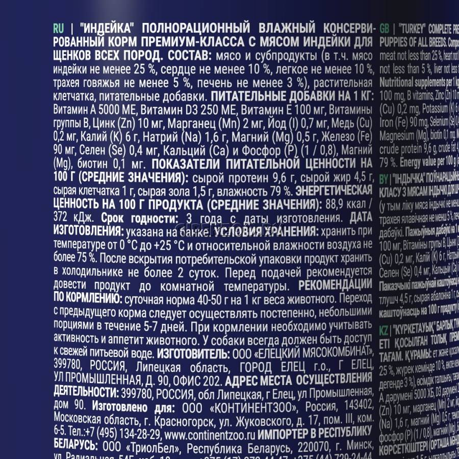 Мясо и субпродукты (в т.ч. мясо индейки не менее 25 %, сердце не менее 10 %, легкое не менее 10 %, трахея говяжья не менее 5 %, печень не менее 3 %), растительная клетчатка.