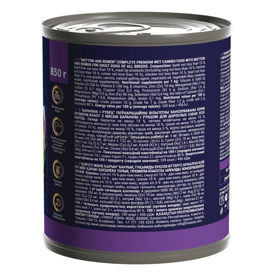 Баранина не менее 15 %, печень говяжья не менее 10 %, субпродукты мясные (в том числе легкое не менее 10 %, трахея не менее 10 %, рубец не менее 10 %), курица не менее 10 %, сердце не менее 5 %, крупа рисовая, морковь, натуральная желирующая добавка, растительное масло, растительная клетчатка, минеральные вещества, вода.