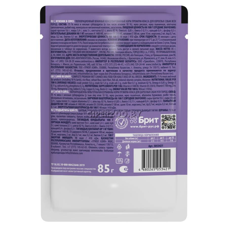 Брит Премиум Пауч для взрослых собак всех пород с ягнёнком в соусе Dog Adult (Brit Premium) - полнорационный влажный корм премиум класса.