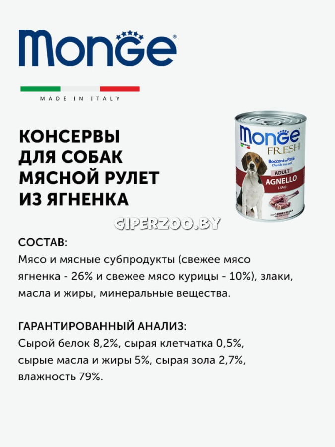 Monge Dog Fresh Adult Lamb (паштет, ягненок), 400 гр*4шт – это полнорационный корм для взрослых собак всех пород с кусочками свежего мяса ягненка.