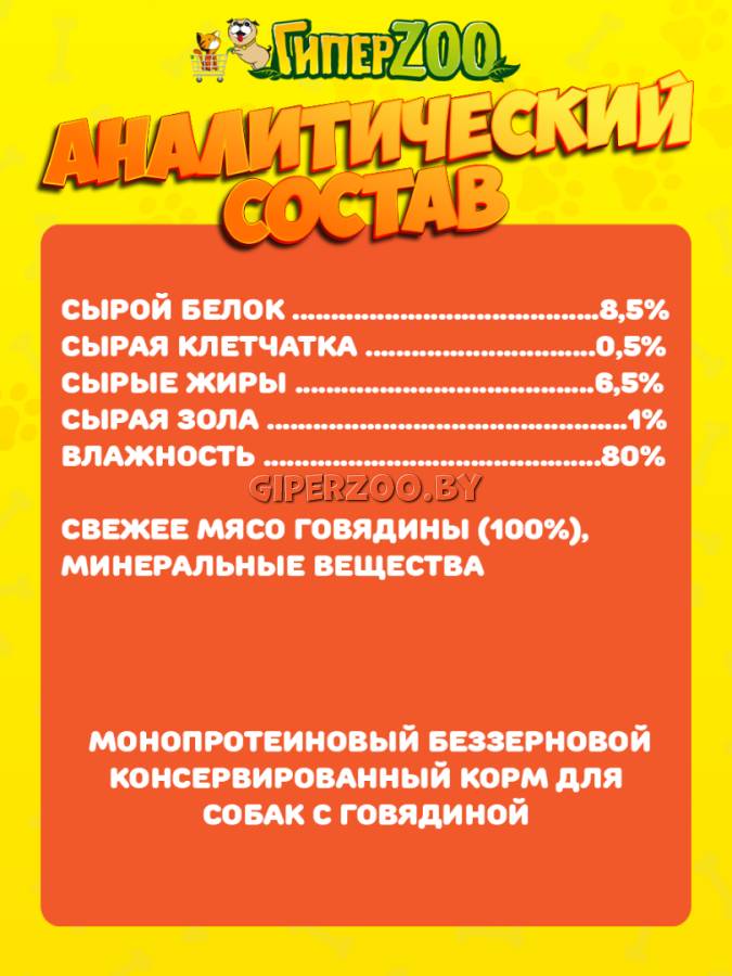 Свежее мясо говядины (100%), минеральные вещества.