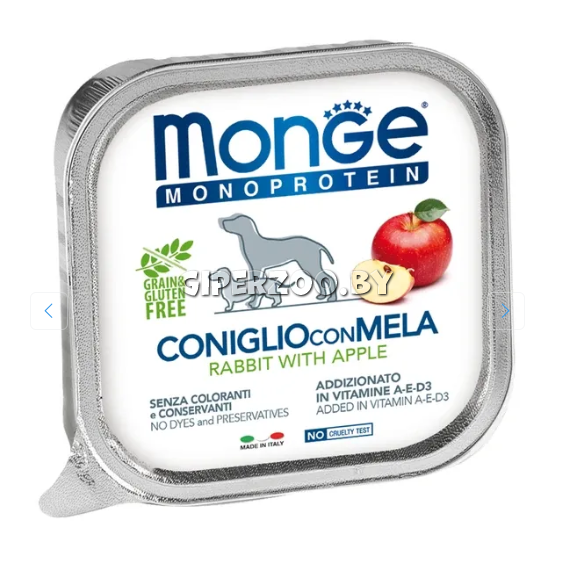 Monge Dog Natural Monoprotein Fruits Паштет из кролика с яблоками – полнорационный беззерновой влажный корм из мяса кролика с яблоком для взрослых собак всех пород. Ароматный мясной паштет из кролика с яблоком для собак, который содержит только один источник белка животного происхождения (кролик), тапиоку (в качестве источника углеводов) и сочное яблоко, которое является источником витаминов и минералов, а также богато клетчаткой, полезной для здоровья кишечника и пищеварения.