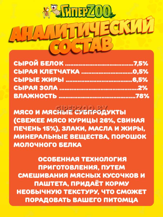 Мясо и мясные субпродукты (свежее мясо курицы 26%, свиная печень 15%), злаки, масла и жиры, минеральные вещества, порошок молочного белка.