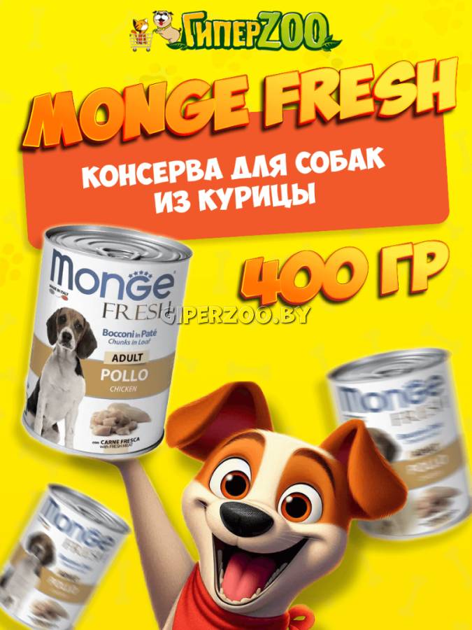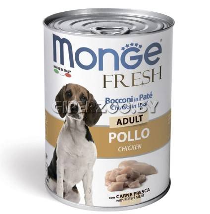 Monge Консервы Fresh Adult (Мясной рулет из курицы) – полнорационный влажный корм с мясом курицы для взрослых собак всех пород. Аппетитные мясные кусочки в паштете для взрослых собак из отборных ингредиентов высокого качества с мясом курицы. Особенная технология приготовления, путем смешивания мясных кусочков и паштета, придаёт корму необычную текстуру, что сможет удивить и заинтересовать вашего питомца.