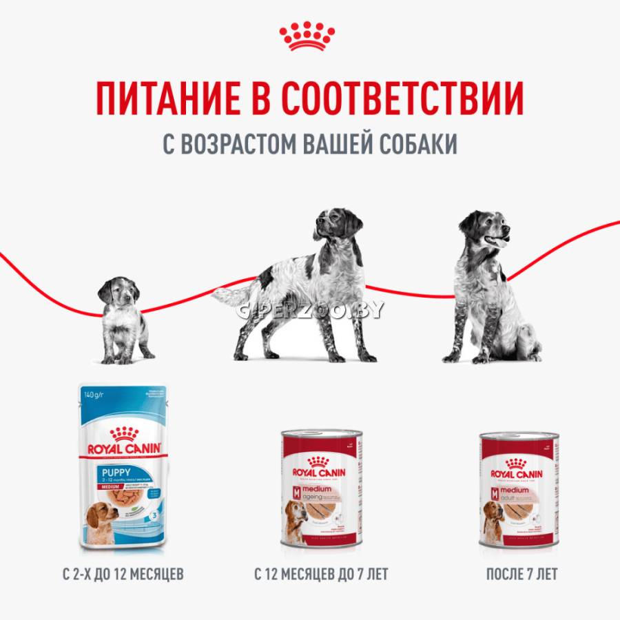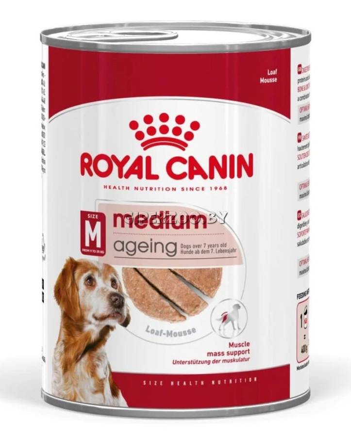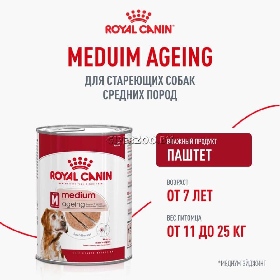 Royal Canin Ageing Medium (в паштете) — корм консервированный полнорационный для стареющих собак средних пород (весом от 11 до 25 кг) в возрасте 7 лет и старше. Способствует поддержанию оптимальной мышечной массы Укрепляет иммуную систему Поддерживает активность и здоровье пожиилой собаки. В состав рациона «ROYAL CANIN Medium Ageing в паштете» входит эксклюзивный комплекс антиоксидантов, который способствует нейтрализации действия свободных радикалов, помогая защитить здоровье вашей собаки в пожилом возрасте.