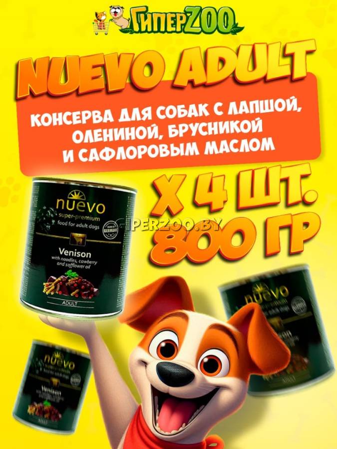 Nuevo Adult с олениной, 800 гр*4шт - лапшой, брусникой и сафлоровым маслом 400 г. Этот корм обеспечит вашу собаку всем необходимым для активной жизни.
