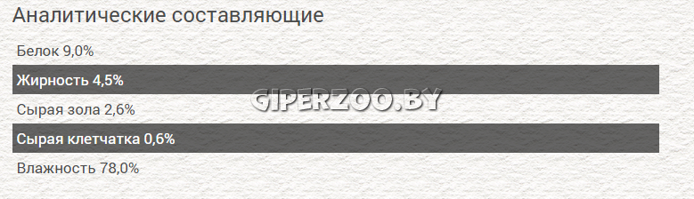 67,0% мясо и субпродукты (26% говядина), 20,7% говяжий бульон, 5,0% рис, 4,0% морковь, 2,0% горох, 1,0% минералы, 0,2% рапсовое масло, 0,1% инулин.