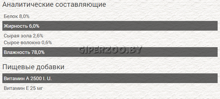 С мясной составляющей до 90% (мясо, субпродукты, а также мясной бульон) и обогащенные, множеством натуральных и ценных ингредиентов животного и растительного происхождения.