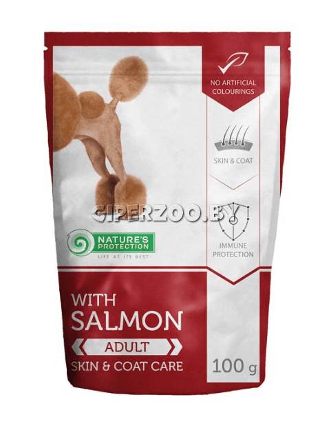 Nature's Protection Adult Salmon Skin&Coat Care - это отлично перевариваемый консервированный корм Super Premium класса, поэтому особенно нравится собакам. С лососем.