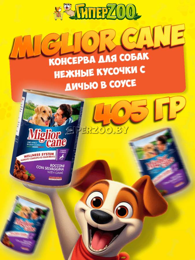 Miglior cane Консервы (Кусочки с дичью в соусе) — это сбалансированный влажный корм для всех пород, представленный в виде нежных кусочков с говядиной в соусе.
