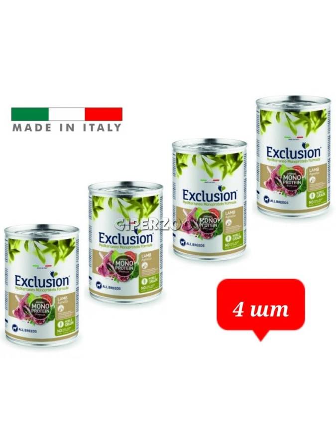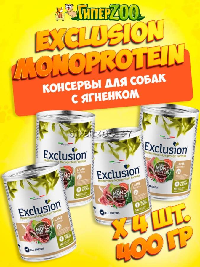 EXCLUSION Monoprotein (ягненок), 400гр*4шт - монопротеиновый рацион на основе белка животного происхождения с мясом ягненка для взрослых собак всех пород.