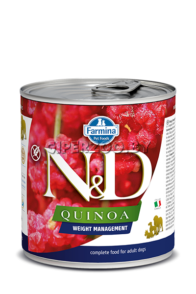 Farmina N&D Dog Quinoa Weight Management – полнорационный диетический влажный корм для собак, рекомендуемый для уменьшения избыточной массы тела.