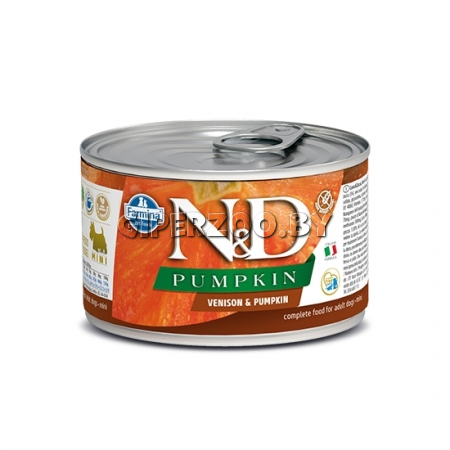 Farmina N&D Grain Free Dog Venison & Pumpkin Mini (оленина и тыква), 140 гр – беззерновой полнорационный влажный корм для собак в небольшой банке со вкусом тыквы и оленины.