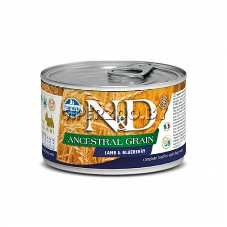 Farmina N&D Ancestral Grain Dog Lamb & Blueberry (ягненок и черника), 140 гр – низкозерновой полнорационный влажный корм для собак со вкусом ягненка и черники.