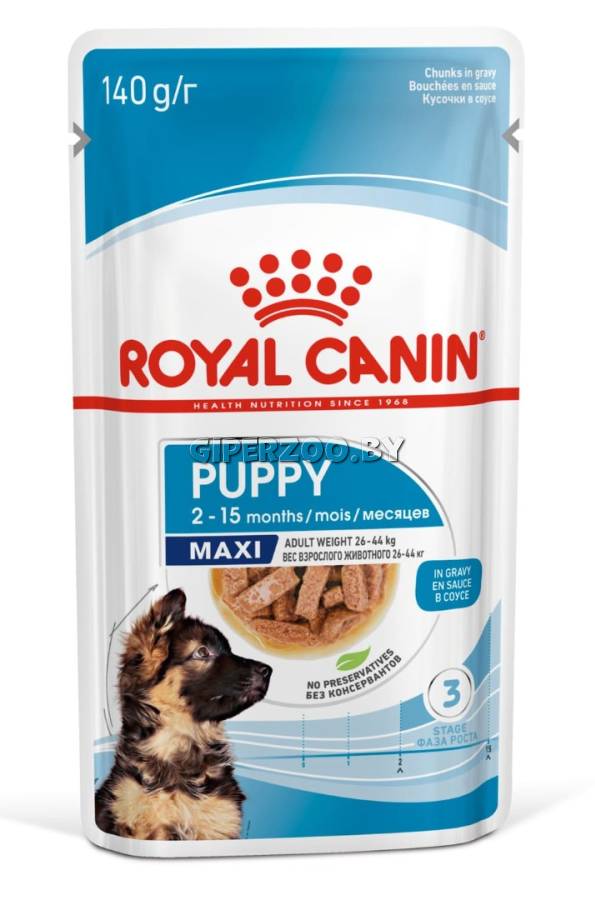 В состав продукта также включены высокоусвояемые белки и пребиотики, регулирующие баланс микрофлоры кишечника и поддерживающие здоровое пищеварение. Royal Canin Maxi Puppy кусочки в соусе отличается умеренной калорийностью, отвечающей потребностям Вашего щенка крупной породы.