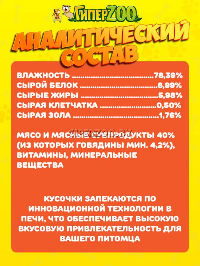 Мясо и мясные субпродукты 40% (из которых говядины мин. 4,2%), витамины, минеральные вещества.