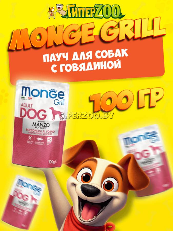 Monge Пауч Grill Adult Dog (Говядина), 100 гр — это полноценный консервированный корм для собак с кусочками говядины.