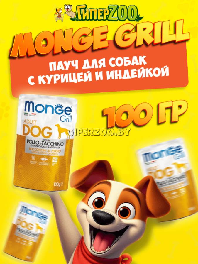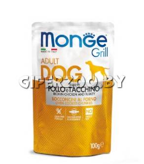 Monge Пауч Grill Adult Dog (Курица, индейка) — это полноценный и сбалансированный корм для собак с кусочками курицы и индейки.