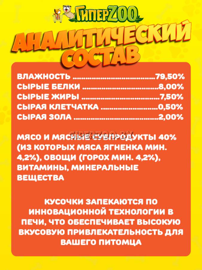 Мясо и мясные субпродукты 40% (из которых мяса ягненка мин. 4,2%), овощи (горох мин. 4,2%), витамины, минеральные вещества.