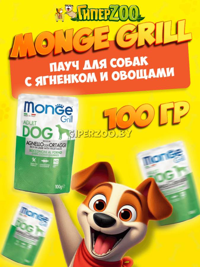 Monge Пауч Grill Adult Dog (Ягненок с овощами) — это полноценный и сбалансированный корм для собак с ягненком и овощами.
