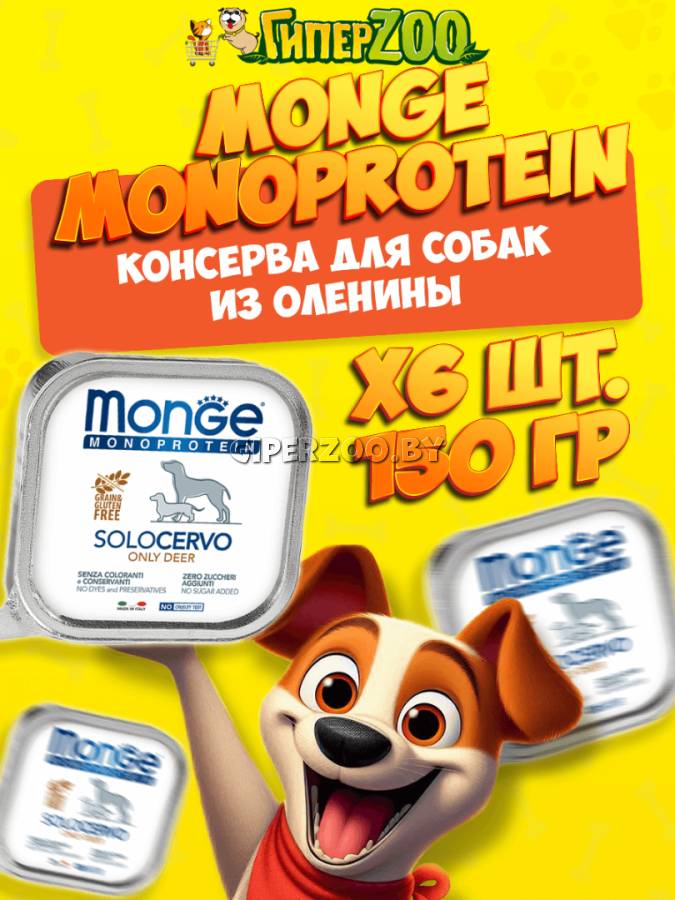 Monge Dog Solo Adult Deer (паштет, оленина), 150 гр*6 гр - это монобелковый паштет для собак из свежего мяса филейной части новозеландского оленя.