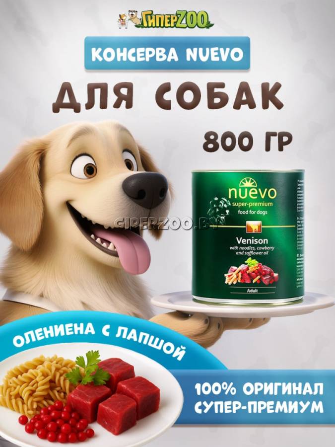 Nuevo Adult с олениной, 800 гр, лапшой, брусникой и сафлоровым маслом 400 г. Этот корм обеспечит вашу собаку всем необходимым для активной жизни.