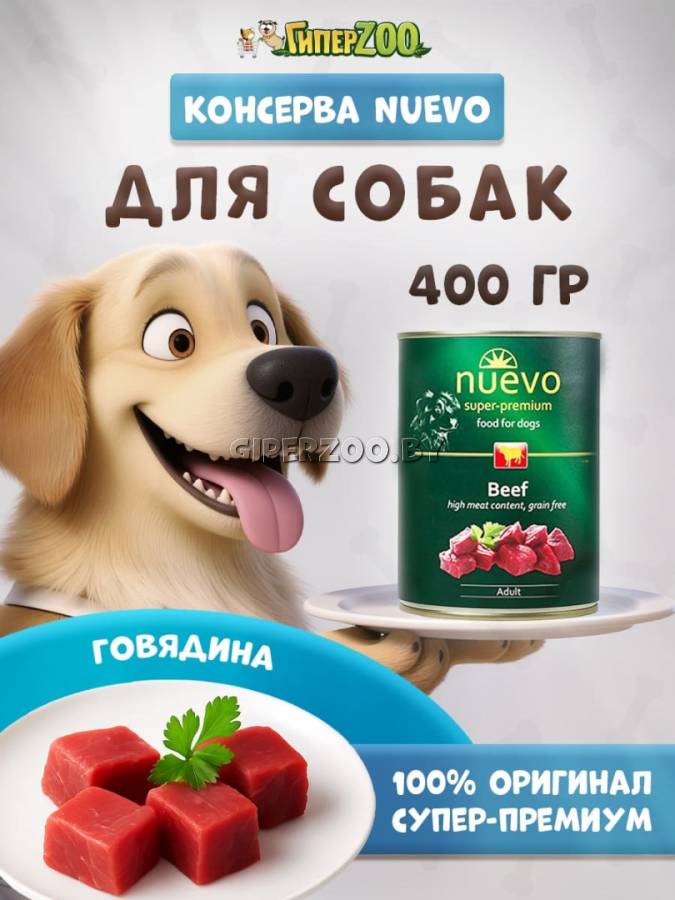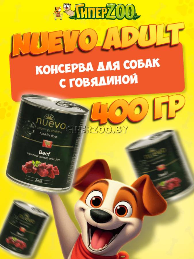 Nuevo Adult с говядиной, 400 гр - высокое сочетание мяса (72%), богатого ценным белком. Этот корм идеально сбалансирован и полноценен, он содержит оптимальное количество всех питательных веществ, необходимых витаминов и минералов. nuevo Beef — отличный источник энергии, легко усваиваемый и очень вкусный.