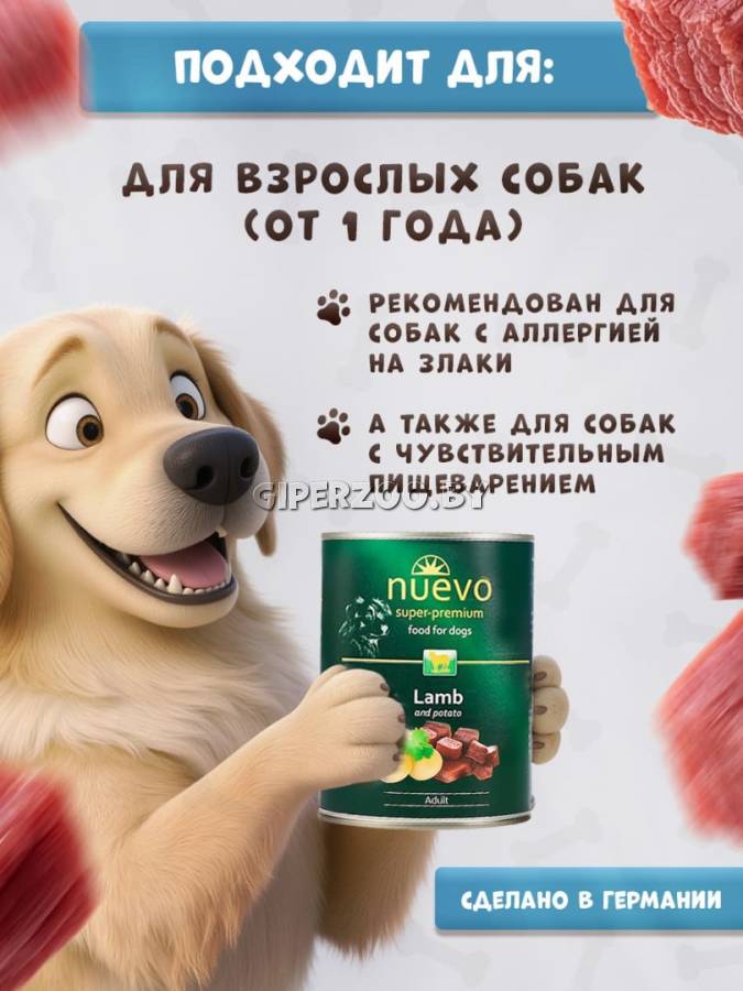 Nuevo Adult с ягненком и картофелем, 400 гр. – это консервированный полноценный рацион с содержанием легкоусвояемого мяса ягненка, удовлетворяющий все потребности собаки в питательных веществах и вкусовых прихотях.