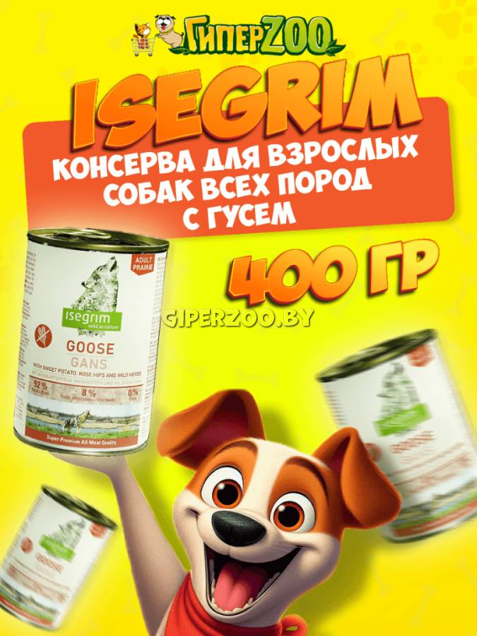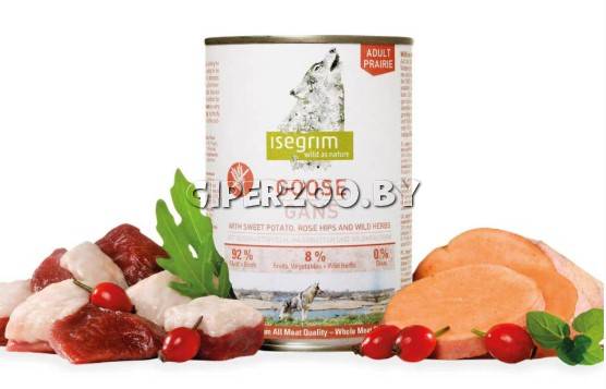 Isegrim PRAIRIE с гусем, 400 гр - полноценный консервированный корм для взрослых собак всех пород супер-премиум класса гусь с бататом, шиповником и дикими пряными травами 400 г. В этом корме для Вашей собаки — разнообразие и неповторимость самой природы.