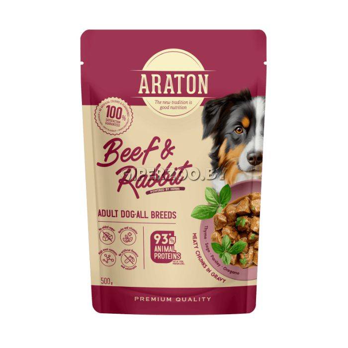 Состав: 78 % мясные ингредиенты в виде кусочков (мясо и субпродукты (в том числе 21 % говядина, 4 % мясо кролика), бульон, рисовая мука, свекольная мякоть, витальный пшеничный глютен, продукты переработки трав 0,1 % (тимьян, шалфей, петрушка, орегано) Пищевые добавки в 1 кг: витамин А (3a672a) – 1000 МЕ, витамин D3 (3a671) – 300 МЕ, витамин Е (3a700) – 100 мг, йодат кальция безводный (3b202) – 0,5 мг, сульфат меди (II) пентагидратный (3b405) – 2 мг, сульфат марганца моногидратный (3b503) – 2 мг, оксид цинка (3b603) – 25 мг Содержание питательных веществ: сырой белок – 8,7 %, сырая клетчатка – 1 %, сырой жир – 3,8 %, сырая зола – 2,5 %, влажность – 82 %, кальций – 0,2 %, фосфор – 0,15 %