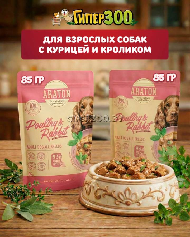 Araton для собак (Птица и кролик в соусе) — полноценный влажный корм Araton с птицей и крольчатиной создан для взрослых собак всех пород от 1 года. Нежные кусочки в соусе с MOS-пребиотиками, травами и клетчаткой – для пищеварения, сытости и ежедневной активности. Формула поддерживает энергию, здоровье пищеварительной системы и общий комфорт собаки.