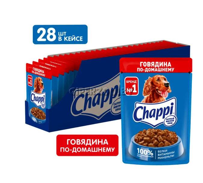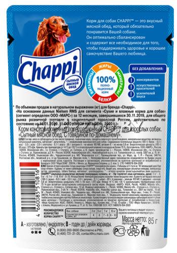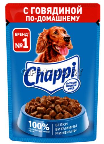 Chappi Сытный мясной обед (говядина по-домашнему) - аппетитная порция мясных кусочков в ароматной подливе, которая приготовлена специально для Вашего питомца. Домашнее меню, составленное по любимым семейным рецептам.
