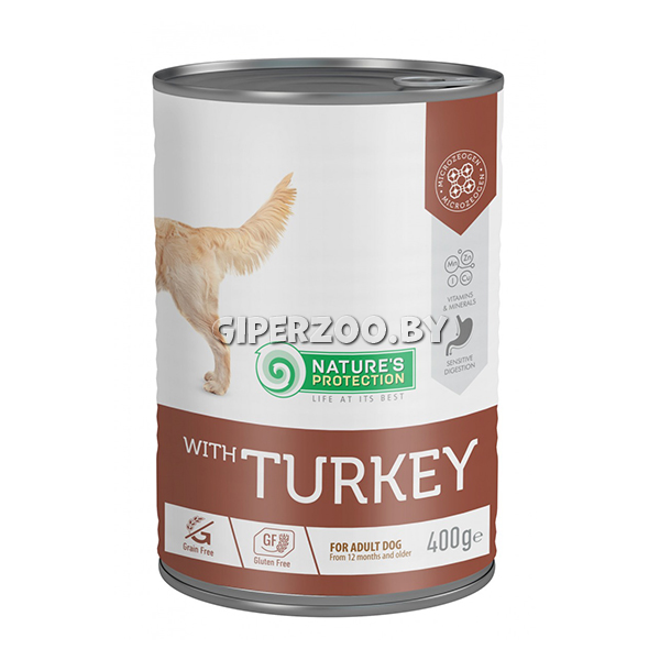 Консервы для собак «Nature's Protection» – это влажный корм Super Premium класса, созданный для удовлетворения различных потребностей молодых и зрелых собак. Аккуратно приготовленные чтобы сохранить натуральный вкус, аромат и питательные вещества каждого рецепта. Идеально сочетается с сухим «Nature's Protection» кормом. Одна баночка готовых к употреблению консервов – оптимальное количество корма, чтобы покормить животное один раз, поэтому удобны и дома, и в дороге, и на выставках. В составе – целых 70% индейки. Индейка – это отличный источник белков. Bысшего качества консервированные корма. Обогащены витаминами и минеральными веществами, которые необходимы для организма животного. С льняным маслом, в котором содержится большое количество жирных кислот Омега-3 и Омега-6, важных для поддержания работы головного мозга и обеспечения отличного состояния кожи и шерсти. Без зерна и глютена, поэтому идеально подходят для взрослых собак с чувствительной пищеварительной системой.