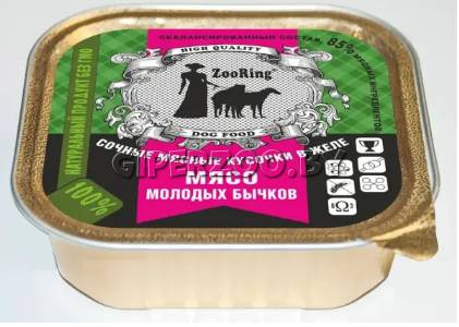 ZooRing Dog Кусочки в желе (Мясо молодых бычков) — консервированный полнорационный корм для всех пород собак.