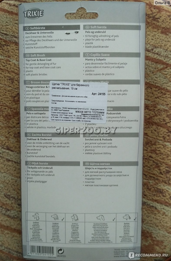 Щетка массажная "TRIXIE"для животных, для бережного расчесывания, мягкая , 19 см артикул: 24155