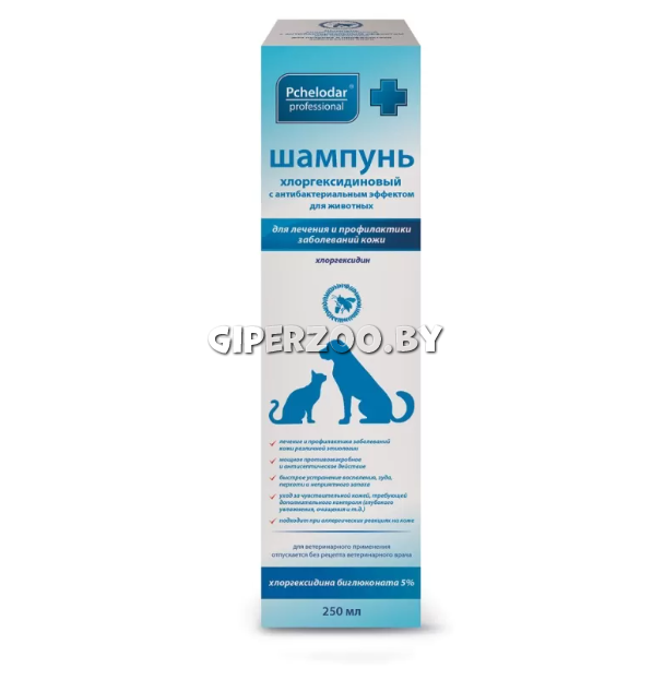 Антибактериальный шампунь пролонгированного действия с хлоргексидином и экстрактом прополиса для животных. Входящий в состав шампуня хлоргексидина биглюконат, оказывает бактерицидное действие на все виды микробов, которые являются причиной различных кожных заболеваний.