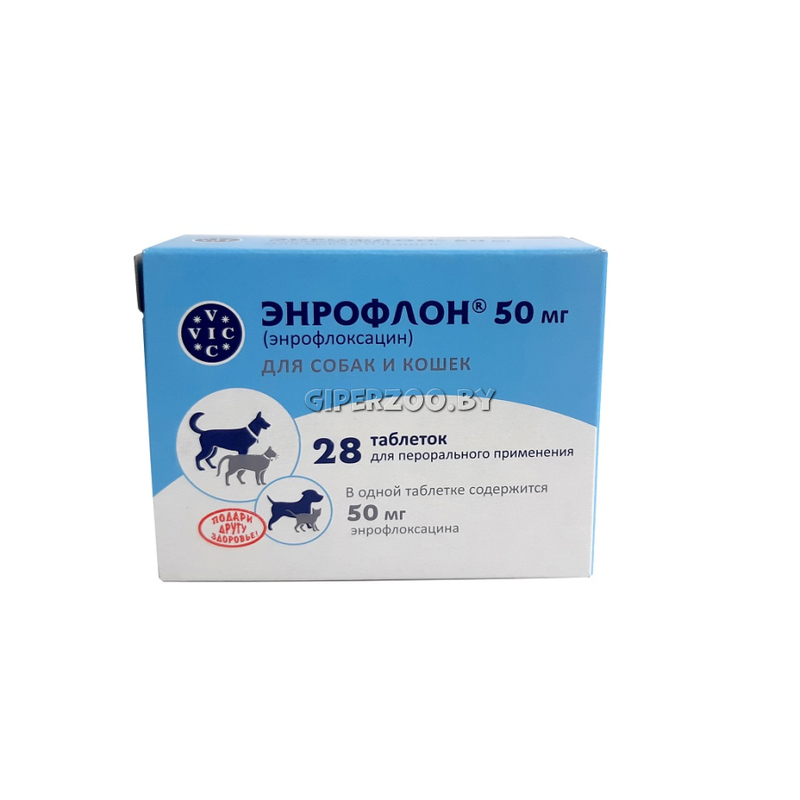 Состав и форма выпуска: Энрофлон 50 мг для кошек и собак выпускается в таблетках по 28 штук в упаковке. Каждая таблетка содержит энрофлоксацина 50 мг.