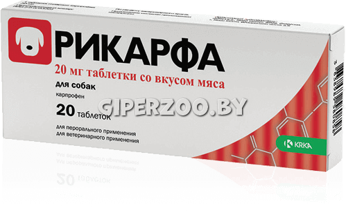 Карпрофен — наиболее изученное нестероидное противовоспалительное, обезболивающее и противоотечное средство последнего поколения для собак в лечении заболеваний опорно-двигательного аппарата. Карпрофен ингибирует фермент циклоксигеназу в цикле арахидоновой кислоты. При этом препарат преимущественно влияет на циклоксигеназу-II, которая вырабатывается в ответ на воспаление. В результате этого блокируется синтез простагландинов. В терапевтических дозах карпрофен значительно слабее действует на циклоксигеназу-I, и благодаря этому не оказывает существенного влияния на синтез протективных простагландинов, недостаток которых в организме способен вызывать нарушения функции почек (замедление почечного кровотока), агрегации тромбоцитов, повышение секреции желез желудка и кишечника, нарушение водно-солевого баланса, сердечной деятельности и другие функциональные расстройства. Препарат обладает антибрадикининовой активностью, подавляя восприятие боли на уровне центральных отделов головного и спинного мозга. Карпрофен быстро всасывается из желудочно-кишечного тракта, и его концентрация достигает пика в плазме крови через 1 – 3 часа после применения внутрь. Время полувыведения составляет около 10 часов. Карпрофен более чем на 99 % связывается с белками плазмы и метаболизируется в печени, выделяясь с фекалиями (около 80 %) и мочой. Рикарфа таблетки со вкусом мяса по степени воздействия на организм теплокровных животных относится к умеренно опасным веществам.