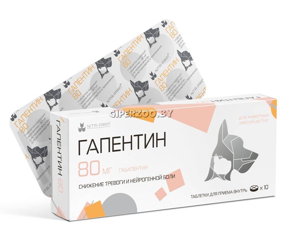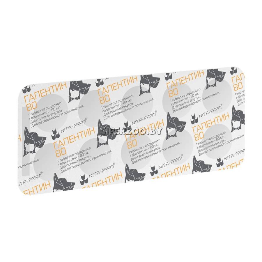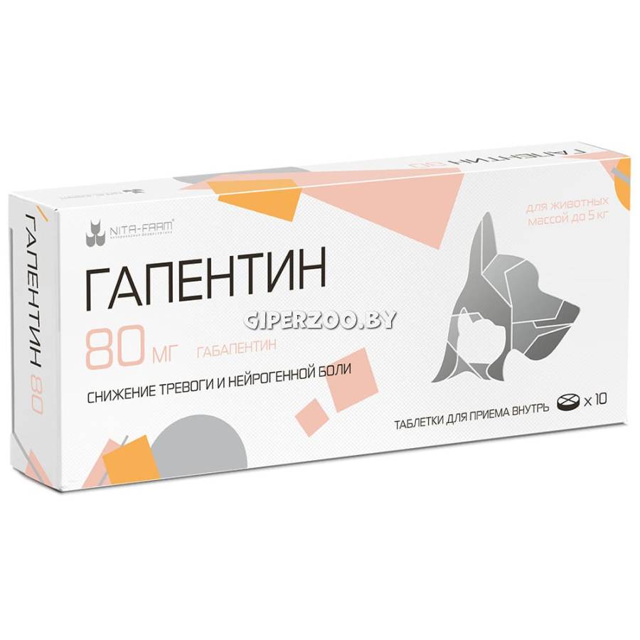 НИТА-ФАРМ Гапентин для кошек и собак 80 мг, 10 таб по внешнему виду представляет собой плоские круглые таблетки серовато-розового цвета, допускаются более темные или светлые вкрапления. Поверхность таблеток гладкая, с фаской, двумя разделительными бороздками на одной стороне и логотипом на другой стороне. Гапентин 80 выпускают расфасованными по 10 таблеток в блистеры. Блистеры по 1 штуке упаковывают в картонные пачки. Каждую потребительскую упаковку снабжают инструкцией по применению препарата.