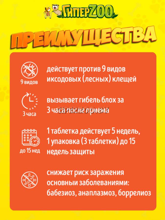 Для эффективного действия препарата, блохи и клещи должны прикрепиться к коже собаки и проглотить активный ингредиент препарата, что вызовет гибель блох через 8 часов и гибель клещей через 12 часов.