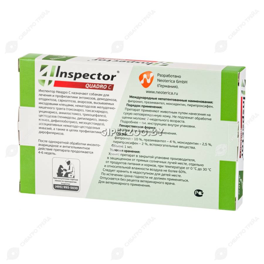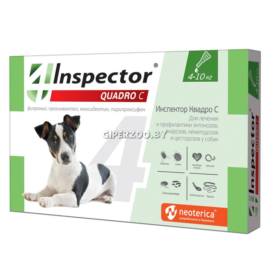 Инспектор Quadro С назначают собакам для лечения и профилактики энтомозов (блохи, вши, власоеды), акарозов (иксодидозы, отодектоз, нотоэдроз, саркоптоз, демодекоз) и нематодозов желудочно-кишечного тракта (токсокароз, токсаскаридоз, унцинариоз, анкилостомоз, трихоцефалез), а также в целях профилактики дирофиляриоза.