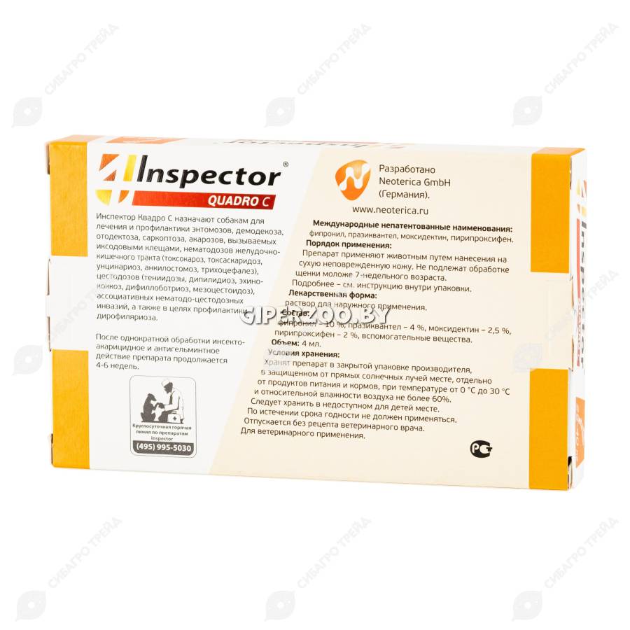 Нанесите Inspector на кожу в области холки (между лопатками), максимально раздвигая шерсть. Не втирайте. Не рекомендовано мыть животное 2 дня до и 4 дня после обработки.