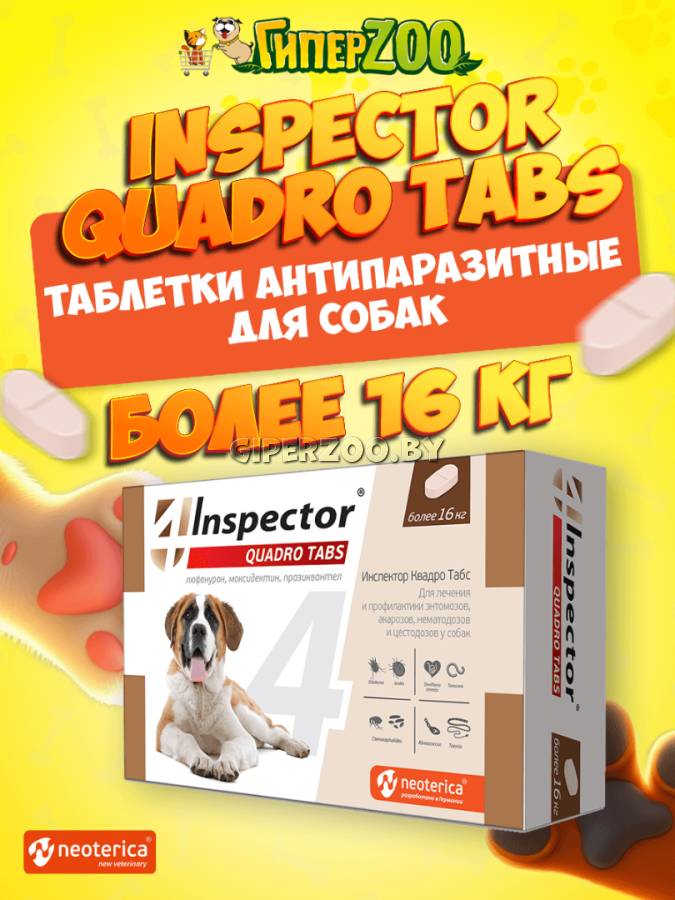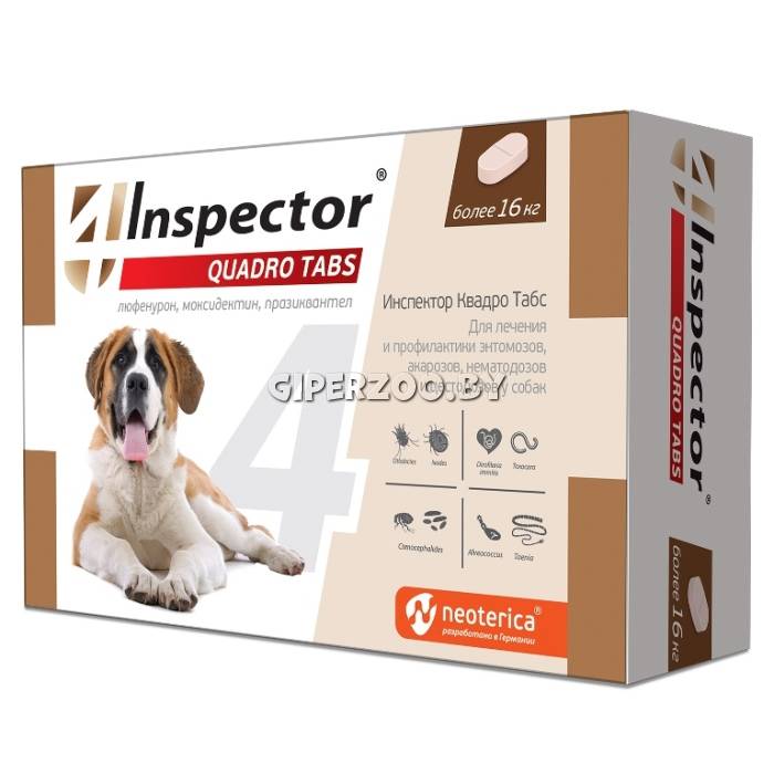 Инспектор Квадро Табс относится к фармакотерапевтической группе "противопаразитарные лекарственные средства в комбинациях".