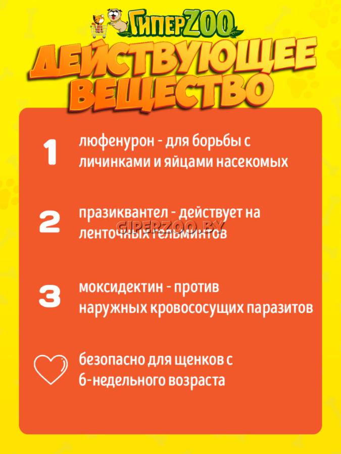 Комбинация люфенурона, моксидектина и празиквантела, входящих в состав препарата, обеспечивает его широкий спектр противопаразитарного действия в отношении всех стадий развития блох (Ctenocephalides felis, Ctenocephalides canis), чесоточных клещей (Otodectes cynotis, Sarcoptes canis, Notoedres cati), демодекозных (Demodex canis) и иксодовых клещей (Dermacentor spp., Rhipicephalus spp., Ixodes spp.), круглых и ленточных гельминтов, паразитирующих в желудочно-кишечном тракте у собак и кошек, в том числе Toxocara canis, Toxocara cati (Toxocara mystax), Toxascaris leonina, Uncinaria stenocephala, Trichuris vulpis, Ancylostoma caninum, Echinococcus granulosus, Alveococcus multilocularis, Mesocestoides lineatus, Dipylidium caninum, Diphyllobothrium latum, Multiceps multiceps, а также личиночных фаз развития Dirofilaria immitis и Dirofilaria repens.