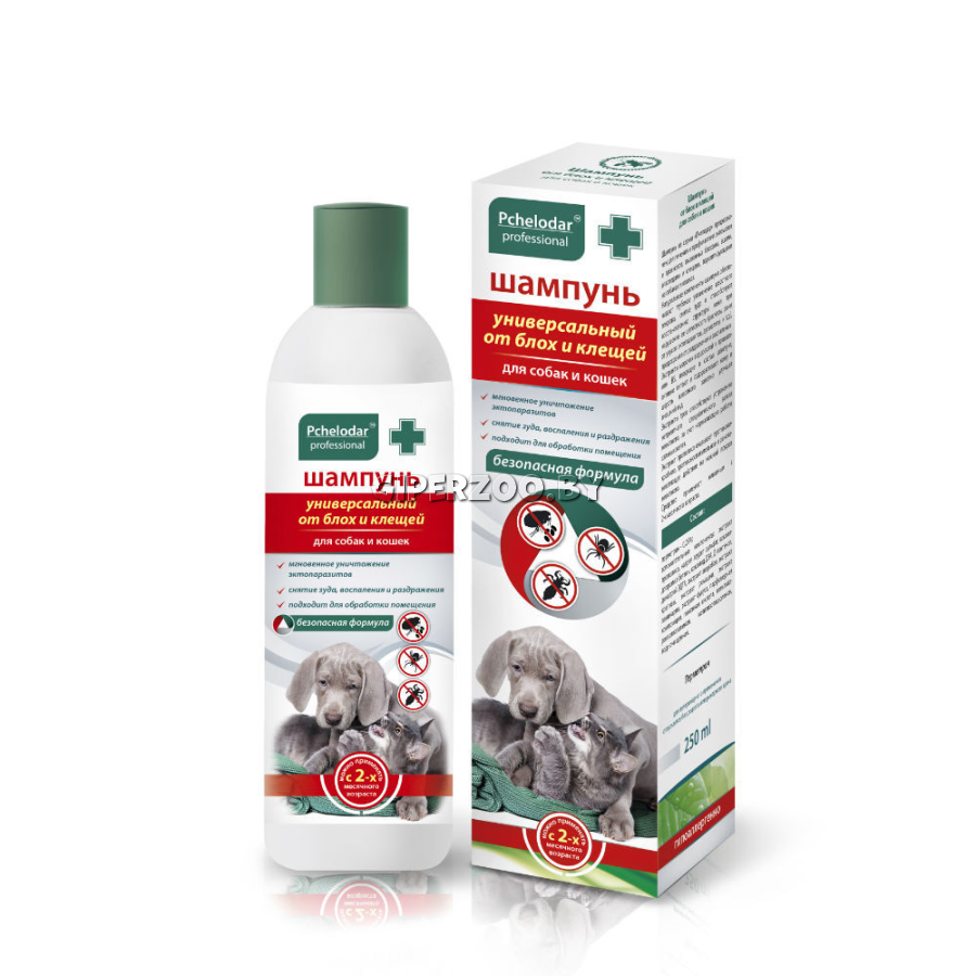 Шампунь Универсальный, содержащий в своем составе 0,25%-перметрин, помогает при однократном применении избавиться от возбудителей энтомозов (блох, вшей, власоедов и клещей), паразитирующих на животных. Входящие в состав средства экстракт прополиса, морских водорослей, сбор трав и Д-пантенол оказывают усиленное увлажняющее и успокаивающее действие, устраняет зуд (после укусов паразитов), снимает раздражения и способствует быстрому заживлению мелких ран, ссадин и расчесов. Шампунь улучшают структуру волоса, придавая шерсти животного эластичность, блеск и ухоженный вид.
